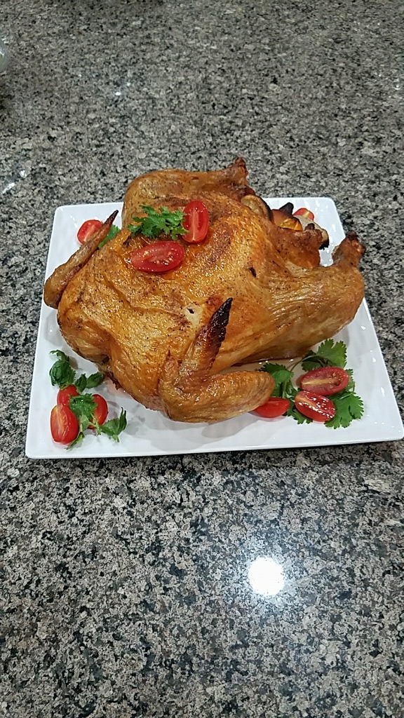Preheat the oven to 425 degrees. Stuff the chicken cavity with the orange, lemon, onion and bay leaves. Tie up the legs with cooking twine and season the outside of the chicken with salt and pepper. Transfer the chicken to a roasting pan, drizzle with a little oil and roast until the juices run clear and a thermometer reads 160 degrees. About 90 minutes.