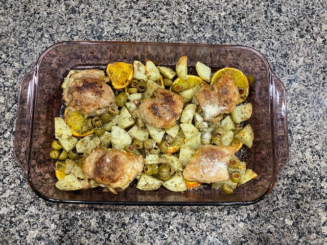 - Remove chicken from oven after 15 minutes, and add the tomato-olive mix on top of the chicken. Put back in the oven for 20-25 minutes.