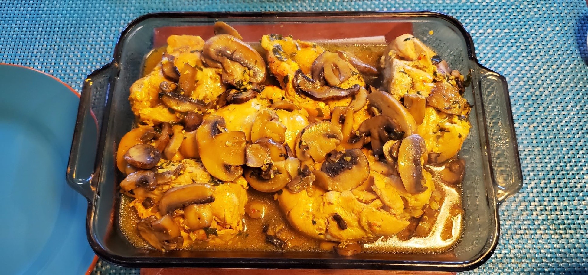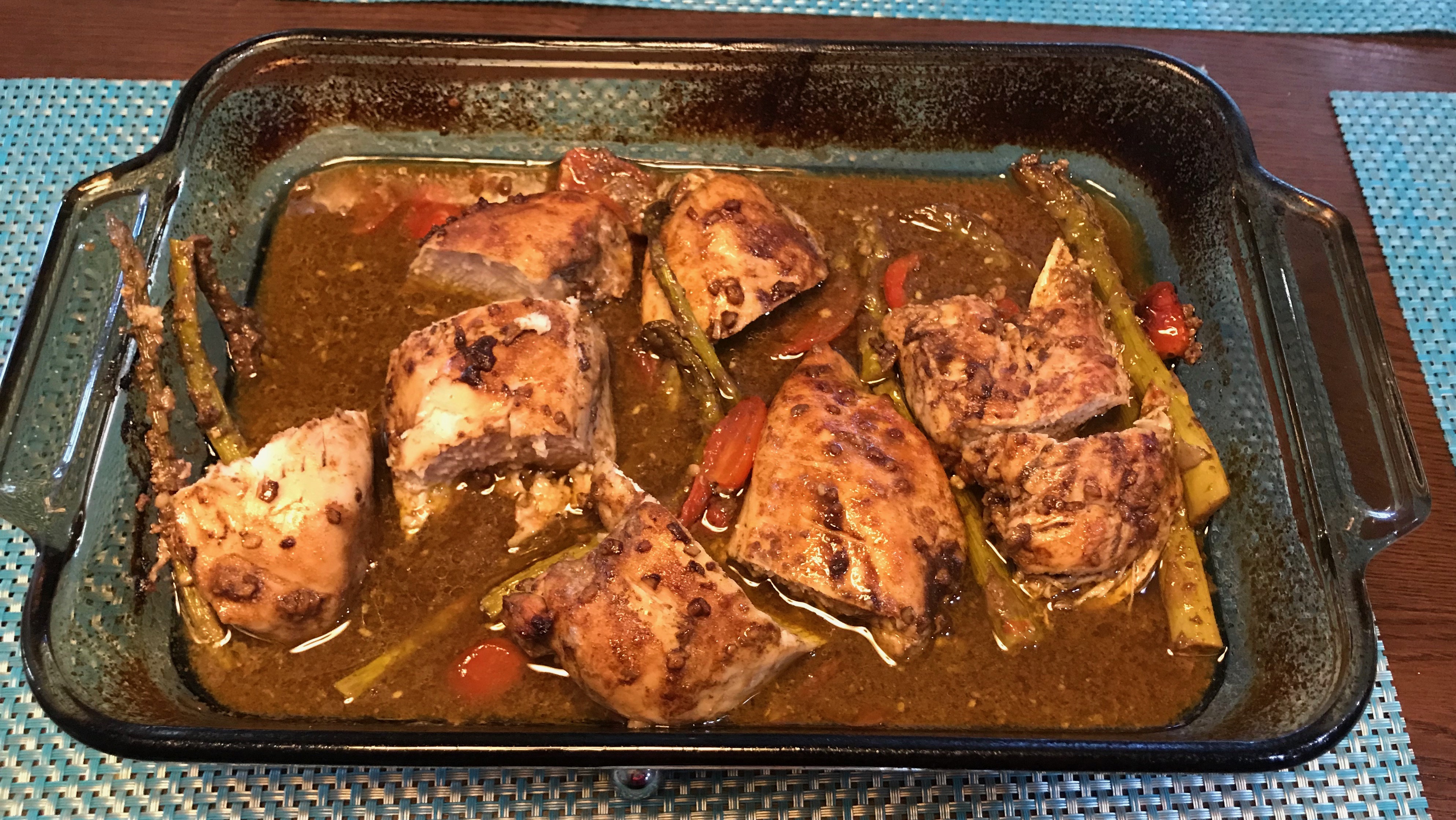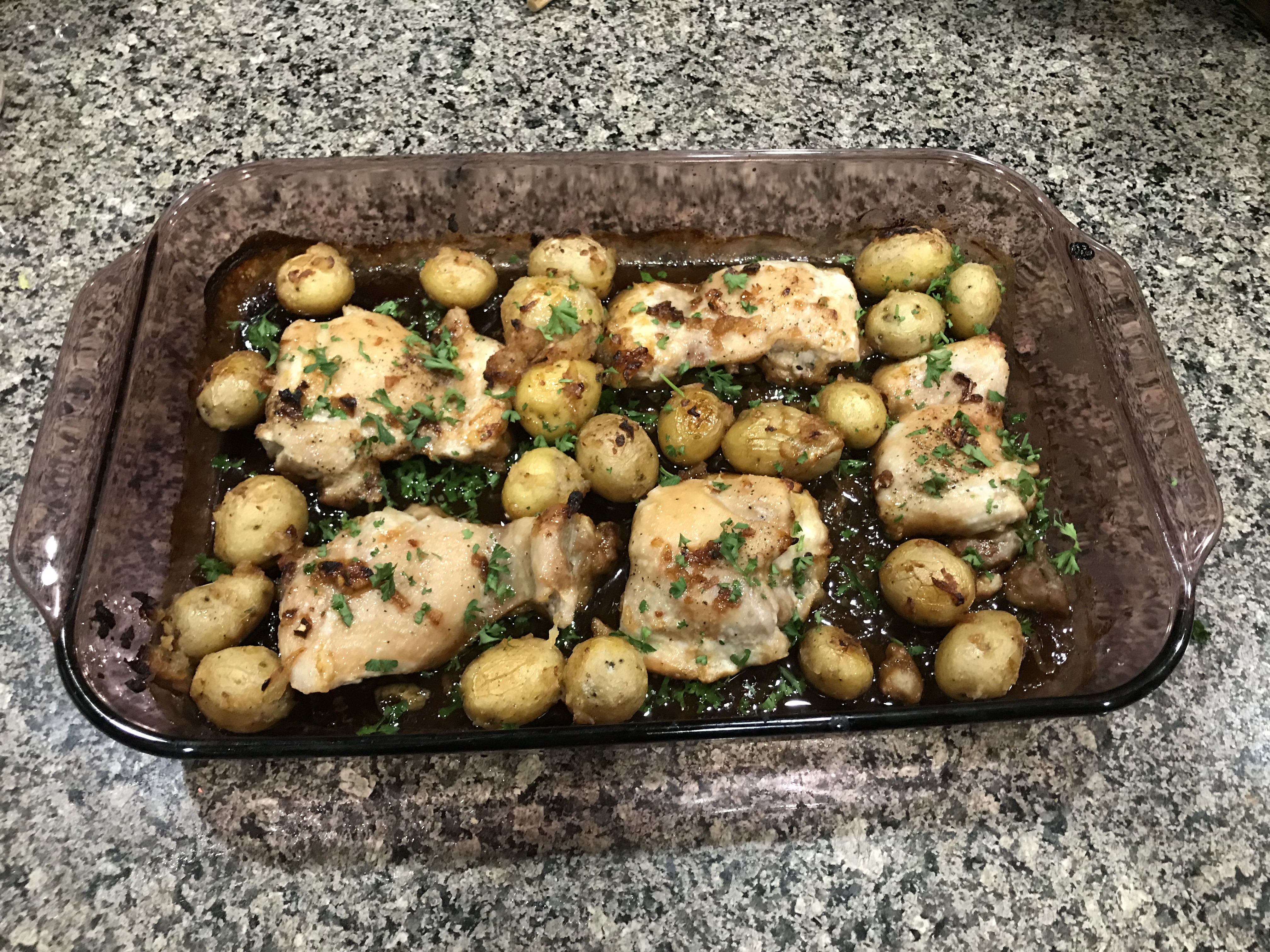 - Return the pan to the oven and roast until the chicken is browned, 20 to 25 more minutes. Sprinkle with chopped parsley, server with the sauce on the side.