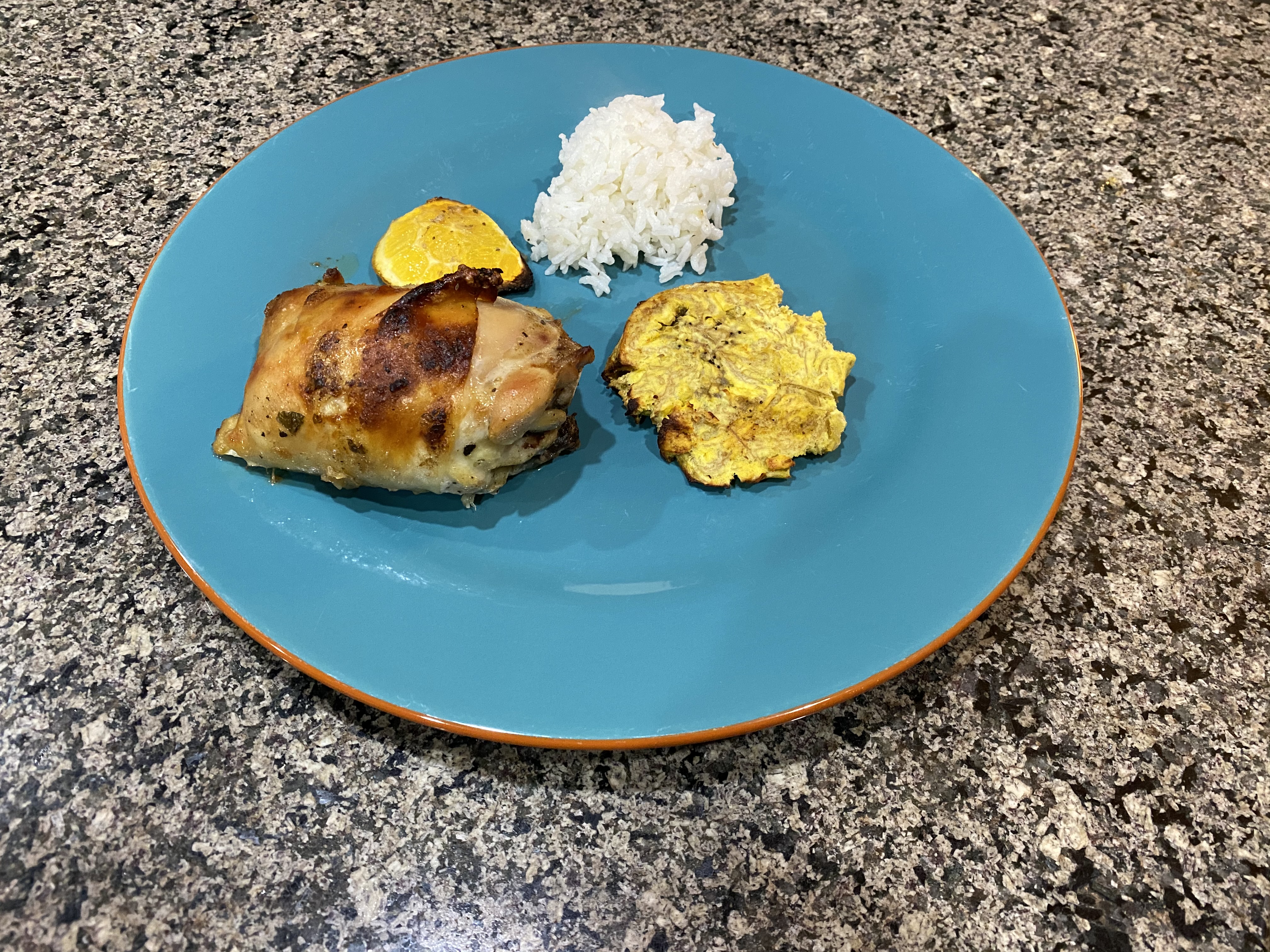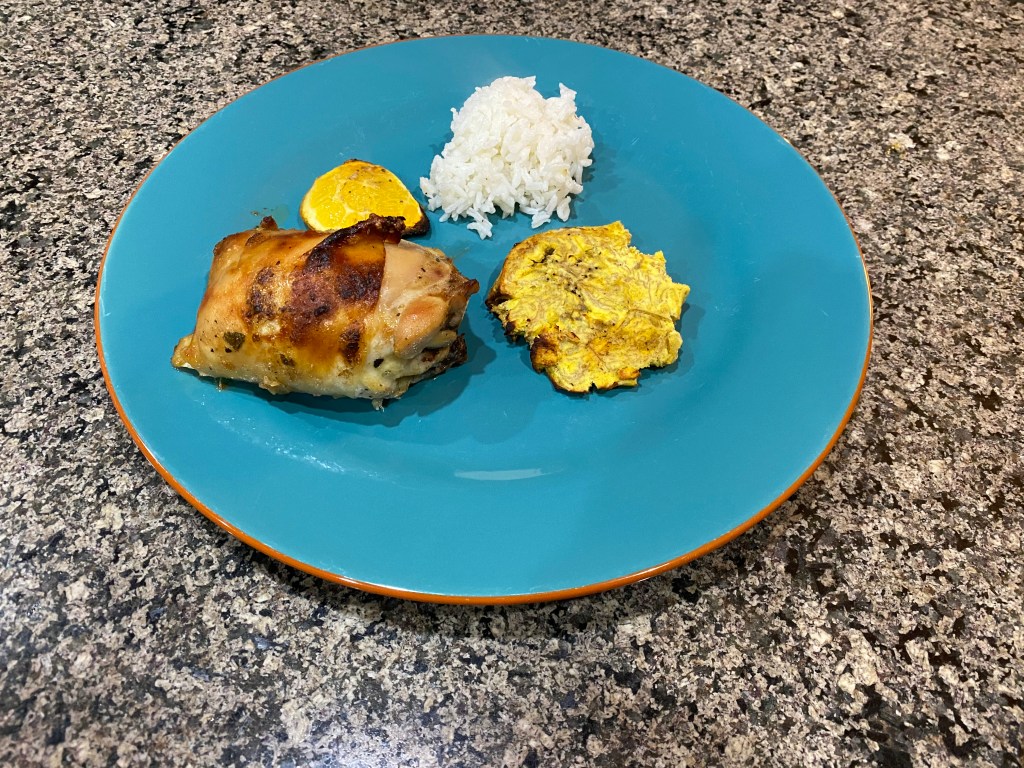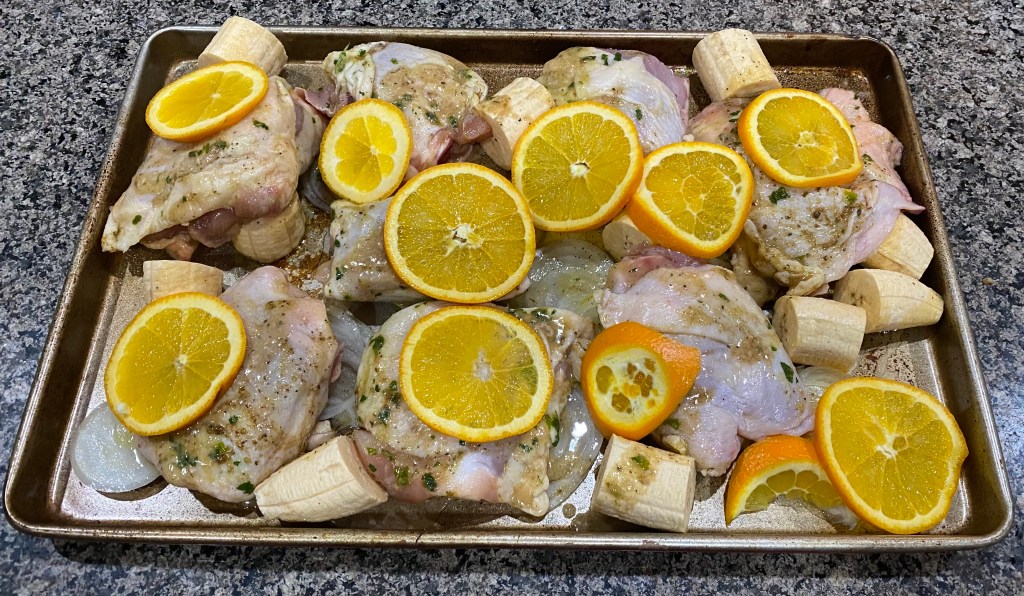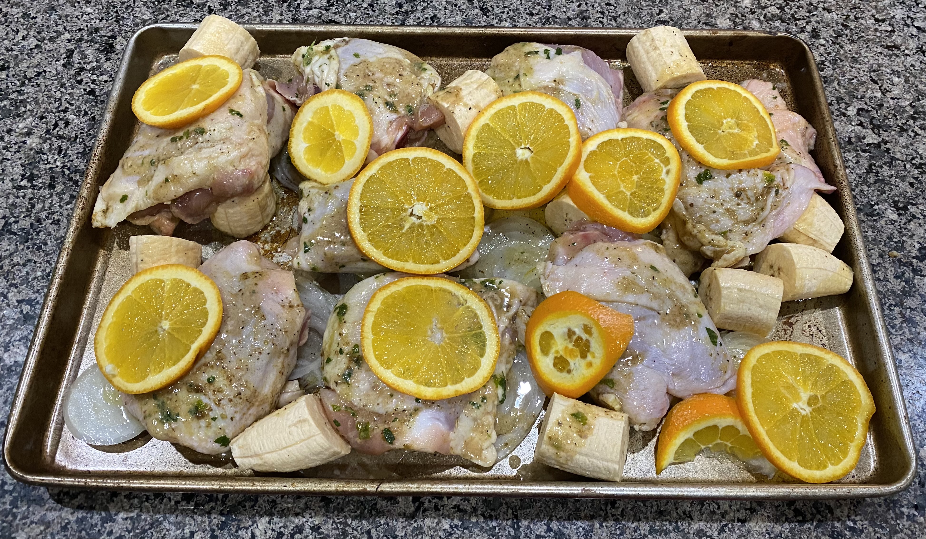 - Preheat over to 450 degrees. Let the chicken come to room temperature. Toss plantains and onions on a baking sheet with the remaining 2 tbsps of olive oil. Season with salt and pepper. Spread out on the baking sheet. Nestle the chicken, skin side-up, and orange slices among the plantains and onions.
