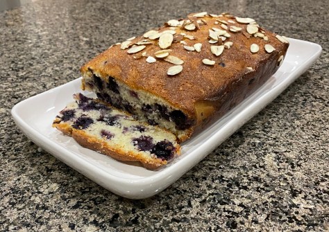 5. Mix remaining 1/4 cup sugar and lemon juice and set aside until loaf comes out of the oven.  While still hot, pierce loaf multiple times with a toothpick. Pour sugar mixture over loaf in plan. Sprinkle remaining almonds. Let cool for 30 minutes before removing from pan.