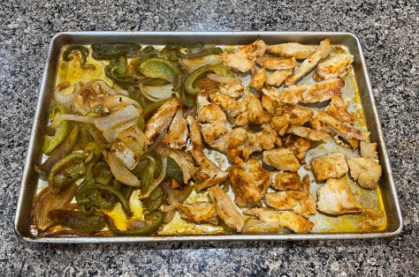 Cut the onion and bell peppers into 1/4-inch wide strips. Place them in a large 13×15-inch casserole dish or a large baking sheet. Slice the chicken breast into very thin strips and add it to the casserole dish with the vegetables.
